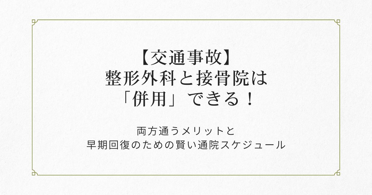 実は、交通事故の治療において、「整形外科」と「接骨院(整骨院)」は両方同時に通うことができるのをご存知でしょうか?