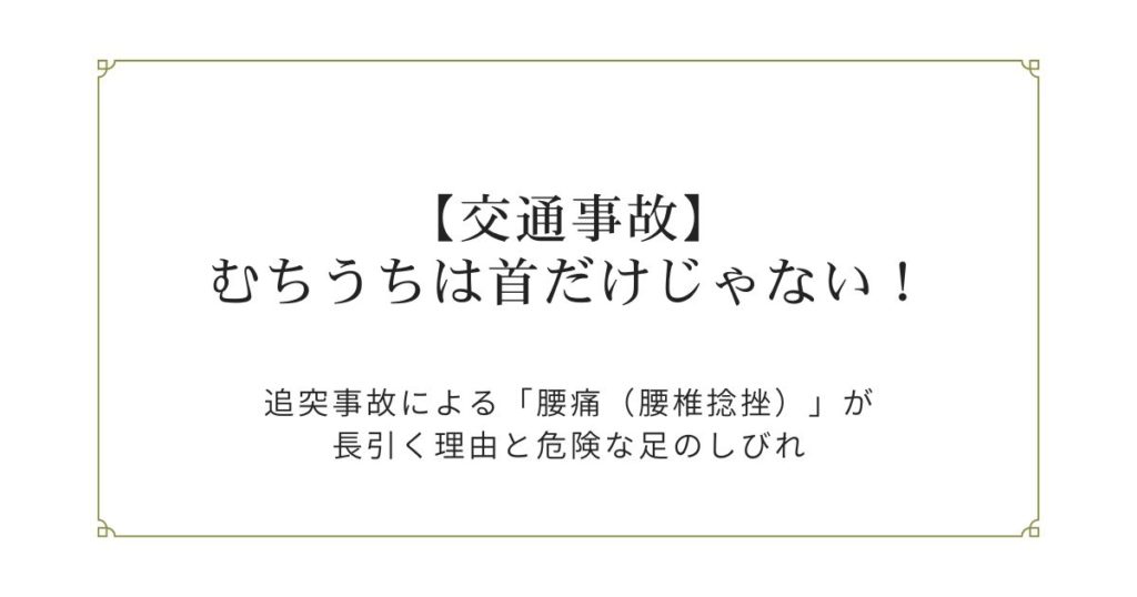 追突事故の後、首だけでなく「腰」も痛くなっていませんか? 交通事故に遭われた後、多くの方が「首が痛い」「首が回らない」といった、いわゆる『むちうち(頚椎捻挫)』の症状を訴えて整形外科や接骨院を受診されます。 しかし、治療を続けていく中で、... -