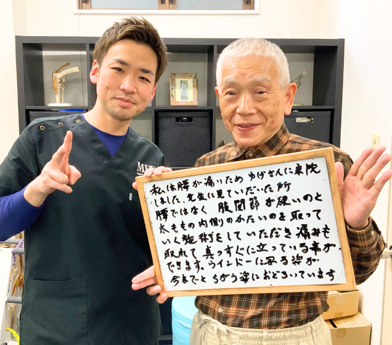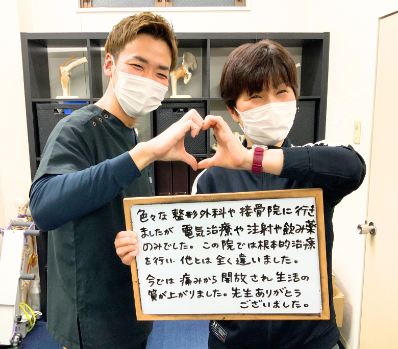 これまでの治療は電気や薬、注射だけ。しかし、こちらでは「なぜ痛みが出ているのか?」を詳しく説明してくれ、 根本改善を目指してくれたのが大きな違いでした。