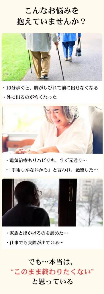 最初は腰の違和感から始まり、次第に脚全体に痺れが広がり、普通に歩くことも辛くなっていました。 整形外科では「年齢的に仕方ない」と言われ、リハビリをしても改善せず、不安でいっぱいでした。