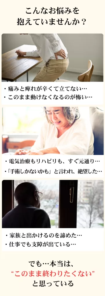 最初は腰の違和感から始まり、次第に脚全体に痺れが広がり、普通に歩くことも辛くなっていました。 整形外科では「年齢的に仕方ない」と言われ、リハビリをしても改善せず、不安でいっぱいでした。