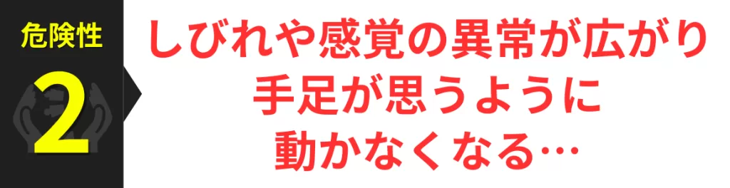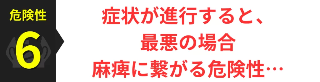 最悪の場合、神経が完全に損傷することで、部分的な麻痺(手足が動かせなくなる)や膀胱直腸障害(排尿・排便が困難になる)を引き起こす可能性もあります。