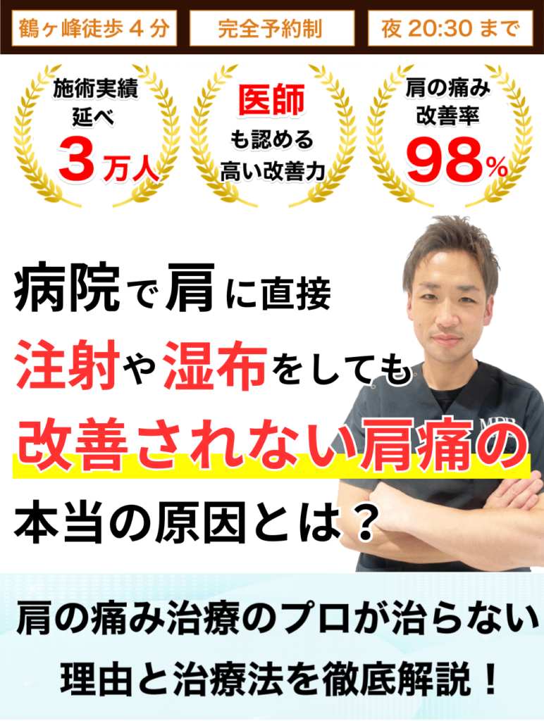 「あなたが長年抱える肩の痛みを改善したいのであれば、肩に対してマッサージや湿布、そして注射などを行う治療から抜け出し、肩の痛みを引き起こしている本当の原因に対して治療を行う必要があります。」