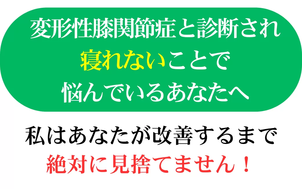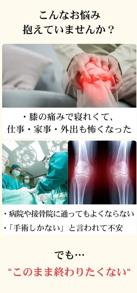 寝ていても膝の痛みで眠れない状態が続いてしまっていたのでこのままもっと悪くなるのではないかと不安でした。