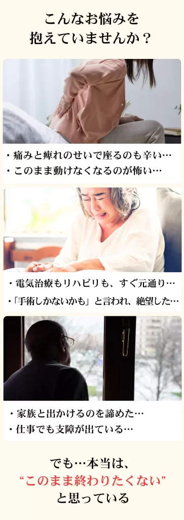 最初は腰の違和感から始まり、次第に脚全体に痺れが広がり、普通に歩くことも辛くなっていました。 整形外科では「年齢的に仕方ない」と言われ、リハビリをしても改善せず、不安でいっぱいでした。