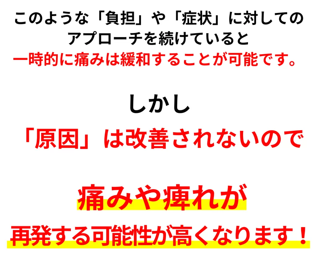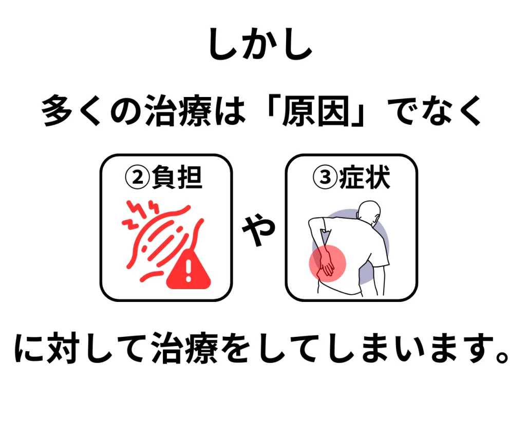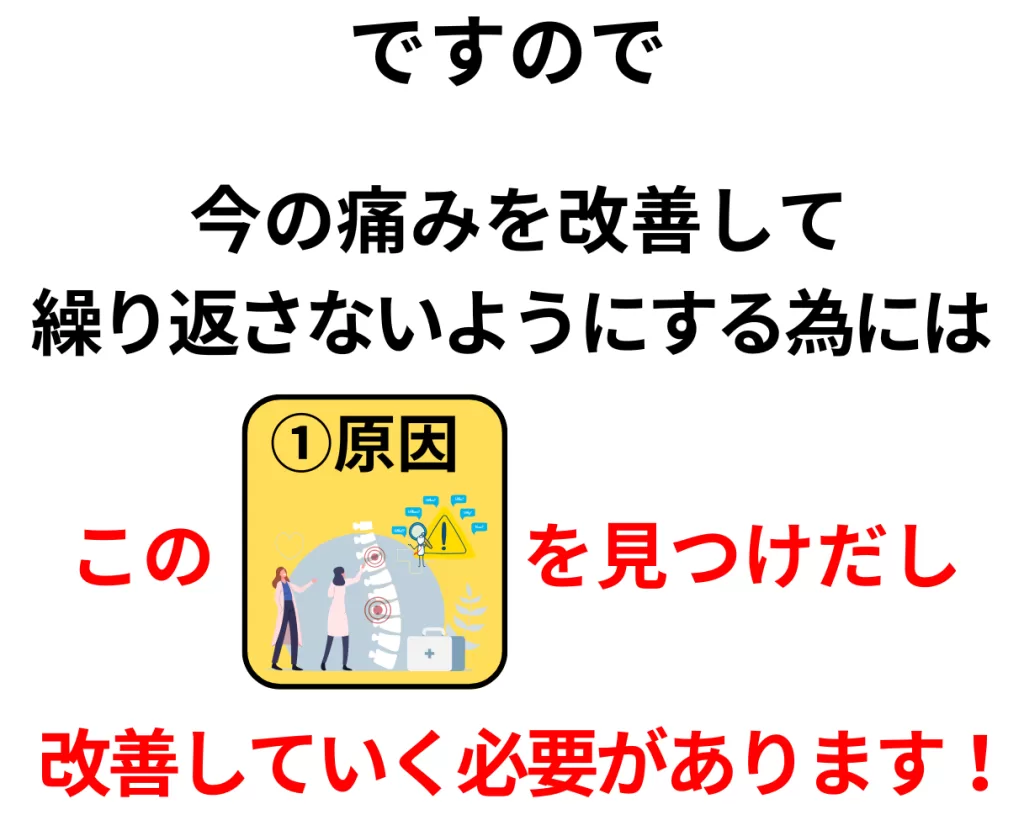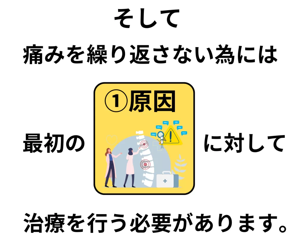 痛みを取ることは大切ですが、痛みを引き起こしてしまった原因を取り除かなければ再発のリスクを高めてしまいます。