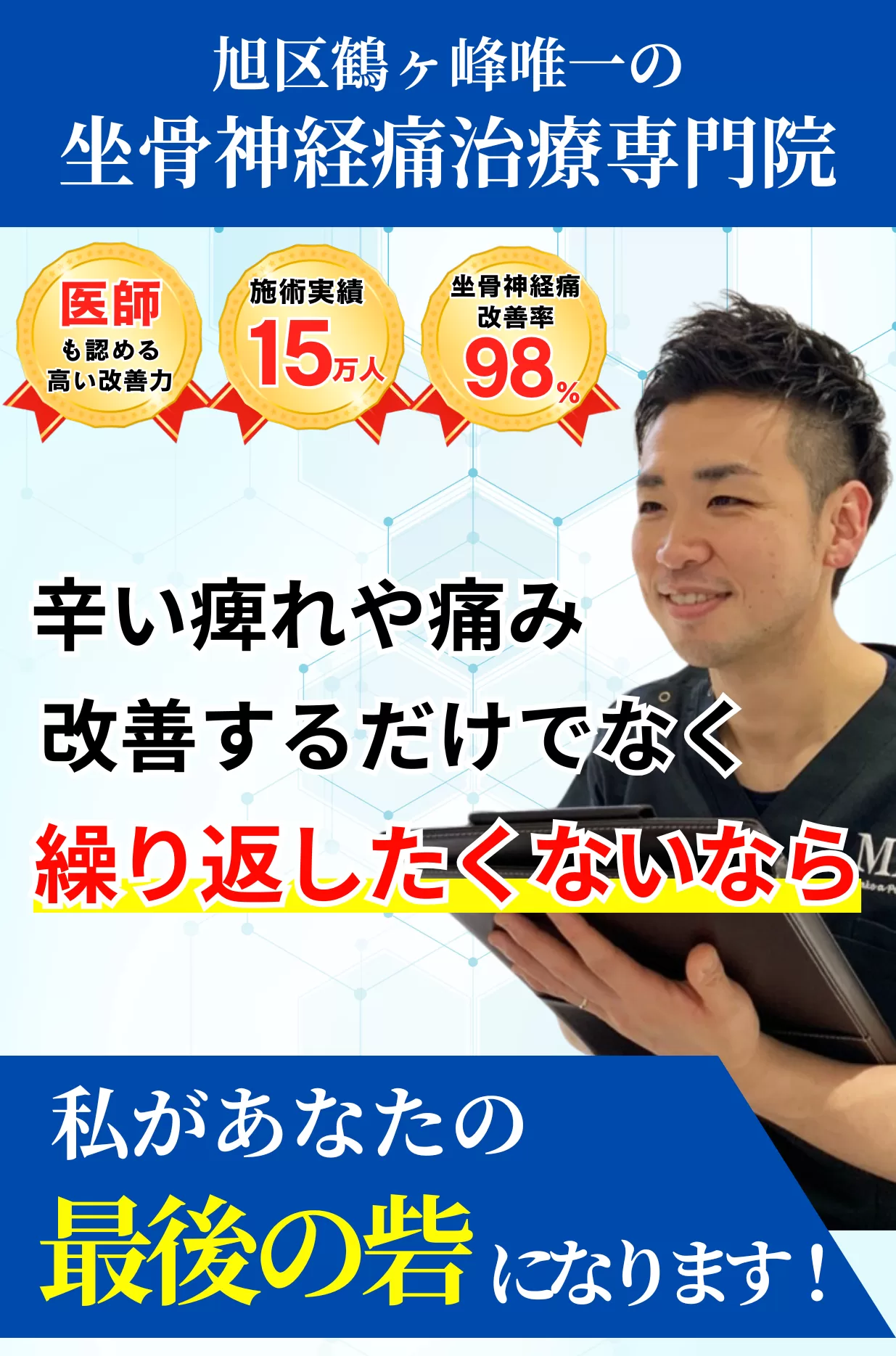 あなたの状態を徹底的に分析して、見つけ出した原因に対してあなたに合った施術を行うことで坐骨神経痛改善率98.3%という高い改善率をを実現しています!!
