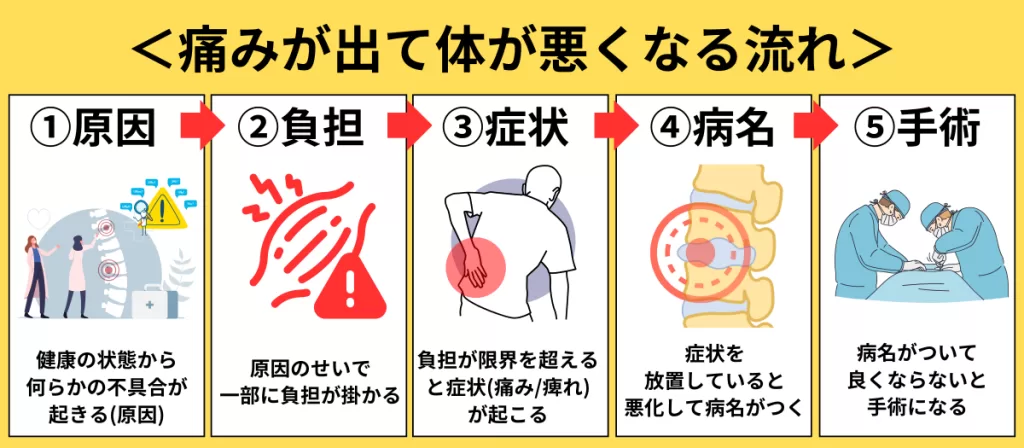 - 負担が限界を超えると痛みや痺れなど「症状」が現れます。
